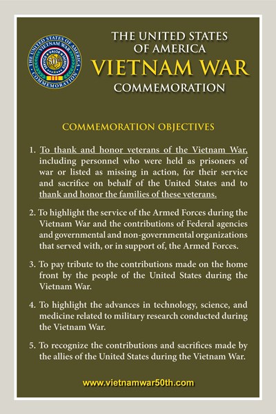 The 2008 National Defense Authorization Act authorized the Secretary of Defense to conduct a program to commemorate the 50th anniversary of the Vietnam War and "in conducting the commemorative program, the Secretary shall coordinate, support, and facilitate other programs and activities of the Federal Government, State and local governments, and other persons and organizations in commemoration of the Vietnam War."