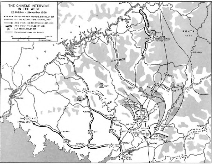 United Nations and U.S. armies have captured the North Korean city of Pyongyang, and the North Korean Army is near collapse. China’s leader, Mao Zedong, has previously agreed to send troops to North Korea if they were needed, and as allied troops approach the Yalu River, Chinese units attack South Korean troops. Shortly thereafter, approximately 200,000 Chinese troops begin to pour south across the border. UN and American forces are slowly pushed back down the Korean peninsula and the Korean War, which the United States had believed to be nearly over, instead enters a new phase.1