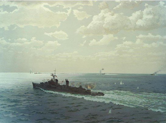The three Soviet-built 66-foot torpedo boats—shadowed by two “Swatow” patrol boats—approach the ship from Hon Me mid-afternoon, moving at approximately 30 knots. The commander of Maddox, Captain John J. Herrick, orders several warning shots as they enter a 10,000-yard perimeter. When the enemy vessels continue their approach undeterred, Maddox opens fire with its 5-inch guns, discharging a total of 283 shells. The intensity of the fire from the American destroyer forces the boats to fire their torpedoes haphazardly and from extreme range, making them easily avoidable. As the torpedo boats turn to withdraw, a single bullet from one of their machine guns hits Maddox’s superstructure. It is the only damage the destroyer takes during the engagement.