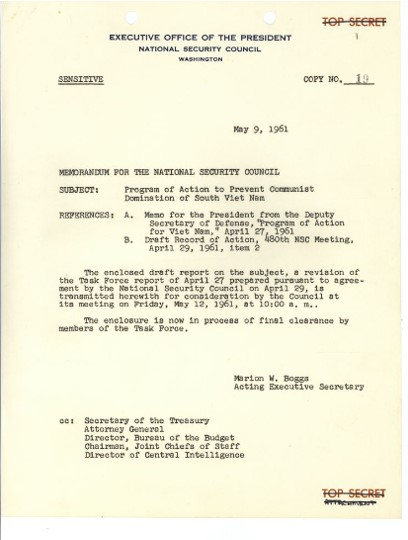 President Kennedy approves National Security Action Memorandum (NSAM) 52. In the memo, Kennedy approves a program of “military, political, economic, psychological” actions of a “covert character” aimed at preventing Communist domination of South Vietnam. Among other stipulations, the memo also states the Kennedy administration’s objectives to increase popular support for South Vietnamese president Ngo Dinh Diem and to use economic and other means to improve the Diem government’s stability and democratic character.1