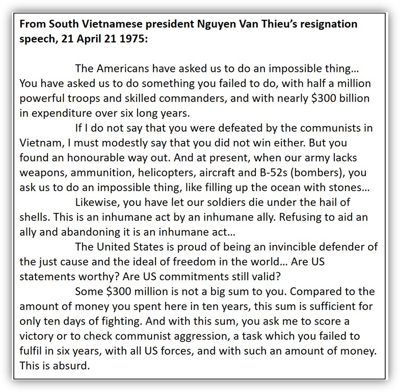 South Vietnamese President Nguyen Van Thieu resigns in favor of Vice President Tran Van Huong. He is a respected 72-year-old, Harvard-educated veteran of the Viet Minh. Unable to initiate negotiations with North Vietnam, he turns the government over to General Duong Van “Big” Minh six days later.1