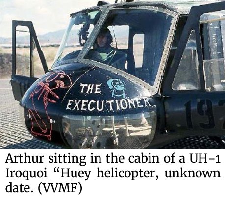 As soon as Big Mother’s flood lights illuminated, the surrounding the area erupted with a murderous string of small-arms enemy fire. After nearly 10 minutes of searching, while taking fire, Big Mother’s crew finally spotted Lloyd running towards them in a rice paddy. The helicopter could not fully land in the paddy for fear of getting stuck in the mud, so Young hovered as low as he could. Lloyd was a tall man, but he lacked the strength to heave himself in. Ankney hauled Lloyd in by his flight suit, while Szymanski returned enemy fire with his M-60. In the crew’s estimation, they took enemy fire from as close as 50 to 70 feet. From aircraft overhead, it looked as though rounds were going straight though the chopper.