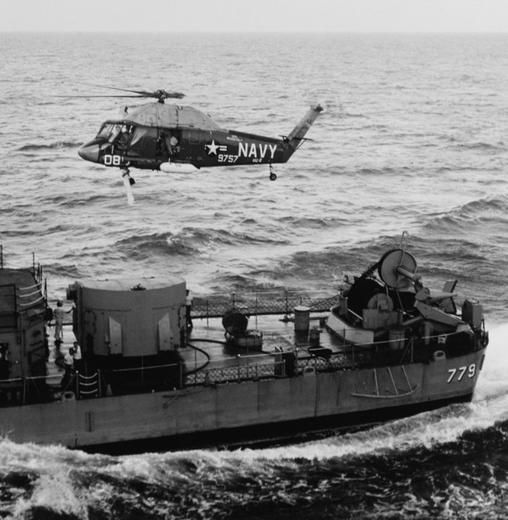A Navy UH-2 Seasprite picks up a crewmember from the destroyer USS Douglas H. Fox for transportation back to the aircraft carrier USS Franklin D. Roosevelt, August 12, 1964. (U.S. Navy)