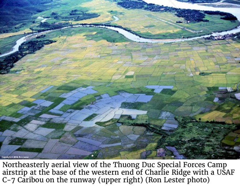 Northeasterly aerial view of the Thuong Duc Special Forces Camp airstrip at the base of the western end of Charlie Ridge with a USAF C-7 Caribou on the runway (upper right) (Ron Lester photo)As the crew lowered its hoist to retrieve the waiting wounded Marines, the jungle erupted in intense enemy small arms and automatic weapons fire causing heavy damage to the avionics equipment just behind the cockpit and forward of the door gunners. The helicopter immediately lost all hydraulic pressure in one of its two hydraulic systems and Terhorst knew he had to make an emergency landing. The helicopter’s second hydraulic system also began gradually losing pressure. The nearest suitable runway was the dirt airstrip for the Thuong Duc Special Forces camp at the southwestern base of Charlie Ridge, surrounded by rice paddies and a river. Unfortunately, an Army C-7 Caribou was sitting in the middle of the runway.