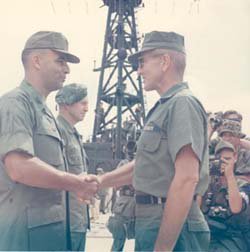 Rear Admiral Elmo R. Zumwalt presents the Navy Commendation Medal to Colonel Rodman Rainville of the 9th Infantry Division on the My Tho River as part of the redeployment ceremony for the U.S. Army 9th Infantry Division, one of the earliest units to redeploy out of Vietnam, July 6, 1969. (Texas Tech University Vietnam Center and Archive)