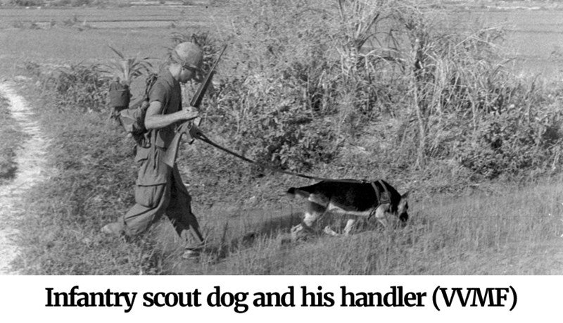 German Shepherds (also called Alsatians) were the only dog breed trained as scouts during the Vietnam War. Other breeds were trained for other missions, such as tracker dogs, sentry/patrol dogs, mine/tunnel dogs, and water patrol dogs. German Shepherds were also trained for some of these other roles, but scout dogs were exclusively German Shepherds. The combination of excellent training with the German Shepherd’s sharp natural instincts, their exceptional loyalty and intelligence, and their acute senses of smell, hearing, and sight made them the ideal war dog. They were trained to alert on enemy movement, snipers, ambushes, booby traps, hidden weapons, food, and medical supply caches, and just about anything that posed a threat to their handlers, and to the rifle companies ahead of which they scouted.