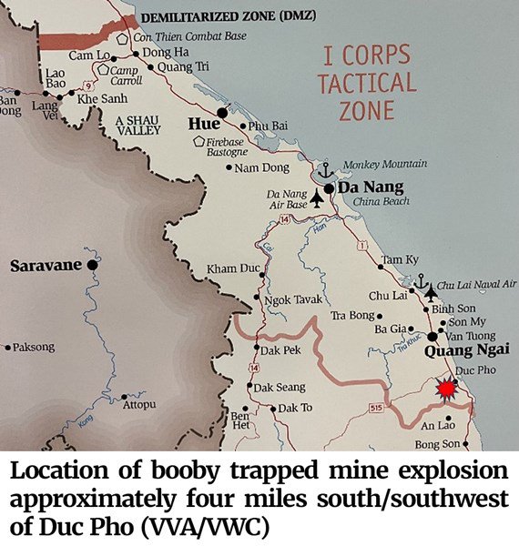 Map of the location of the booby trapped mine explosion, approximately four miles south/southwest of Duc Pho (VVA/VWC)FULL STORY: On March 1, 1971, the Americal Division, headquartered at Chu Lai along the coast in southern I Corps, commenced Operation FINNEY HILL, a mission “to locate and destroy the Viet Cong (VC) Quang Ngai Provincial Headquarters and the 21st North Vietnamese Army (NVA) Regiment.” It continued until July 1, 1971. The area of operation stretched from the Song Tra Khuc River south to the I Corps boundary with II Corps, and from the South China Sea west to near the Song Re river. By employing rifle company saturation patrols, ambushes, night movements, and combined combat assaults with Army of (South) Vietnam (ARVN) units, the division successfully curtailed enemy flexibility, preventing the massing of forces for a major attack. FINNEY HILL also assisted the South Vietnamese local militias (the Regional Forces/Popular Forces, or RF/PF, sometimes called the Ruff-Puffs) in combat assaults conducted on behalf of the South Vietnamese government’s Pacification and Revolutionary Development Program and the Rice Denial Program.