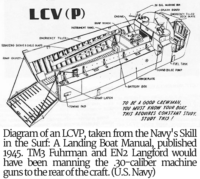 The sailors aboard the landing craft did their best to cover the Marines’ withdrawal. Two of them manned the LCVP’s twin .30-caliber machine guns. Torpedoman, Petty Officer Third Class William R. Fuhrman was firing over the Marines’ heads when he was hit and killed by enemy fire. Fuhrman was 22 years old from Chicago, Illinois. The other machine gunner was Engineman, Petty Officer Second Class Richard H. Langford, a 23-year-old from Dover, Arkansas. Langford was not supposed to be on this mission, but he had volunteered for it in place of a buddy recovering from an earlier mission. Langford managed to hold his covering fire long enough to get the Force Recon team back aboard and for the LCVP to get off the beach. He was killed just at that moment by a rifle round. Langford earned a posthumous Bronze Star for his sacrifice that morning.