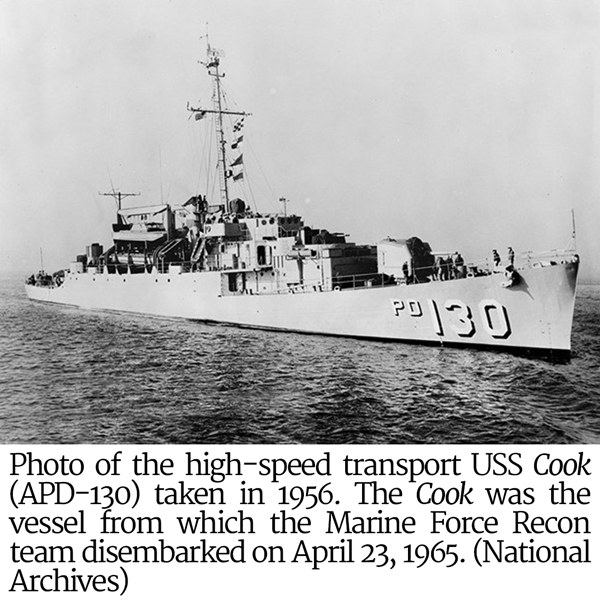 uss cookOn April 22, 1965, a Marine Force Recon team from 1st Force Reconnaissance Company, Headquarters Battalion, 3d Marine Division, aboard the high-speed transport ship USS Cook, received orders to scout an area along the Tra Bong River,