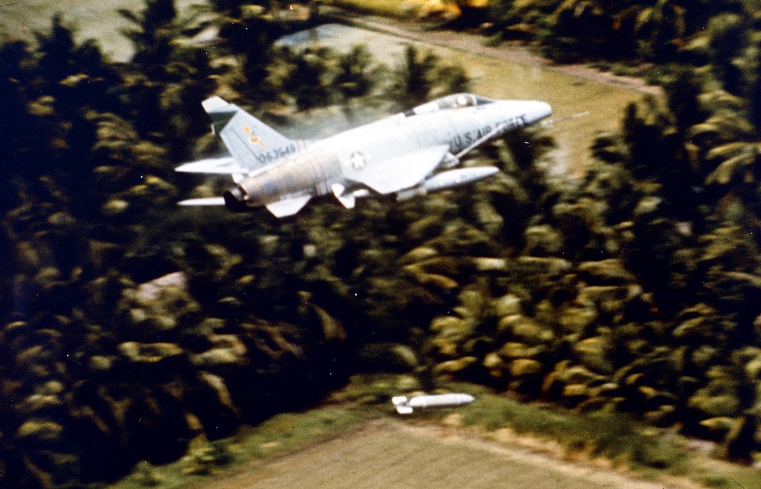 F-100 Super Saber releasing a bomb over the Mekong Delta, unknown date. Major George Smith was flying an F-100 when he was shot down on April 3, 1965. (U.S. Air Force)