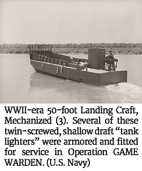 Photo of a WWII-era 50-foot Landing Craft, Mechanized (3). Several of these twin-screwed, shallow draft “tank lighters” were armored and fitted for service in Operation GAME WARDEN. (U.S. Navy)