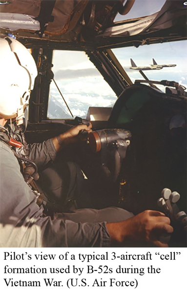 Pilot’s view of a typical 3-aircraft “cell” formation used by B-52s during the Vietnam War. (U.S. Air Force)