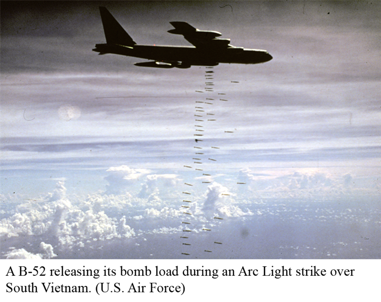 Ground crewmen load bombs onto a Strategic Air Command B-52. (U.S. Air Force)In the 1960s and 1970s, the United States’ B-52 force was not under the authority of Military Assistance Command, Vietnam (MACV) like almost all other American forces, but instead remained under the control of Strategic Air Command (SAC) and the Department of Defense. Because of this, MACV could not order, but had to formally request, each B-52 mission. While eventually most of these requests became pro-forma, SAC leaders initially resisted these requests. Early in the Cold War, Stratofortresses had been designed and built specifically to carry nuclear weapons as part of the United States’ nuclear triad. Deploying the bombers for non-nuclear missions in Vietnam, SAC leaders argued, took them out of the line of defense against attack by the Soviet Union, either in Europe or North America, and therefore compromised America’s nuclear readiness. Moreover, using B-52s to drop conventional, unguided “iron bombs” required a complete refit of the aircraft, as they were not intended to carry this kind of ordnance. Despite these critiques, the first B-52 strikes in Southeast Asia occurred in 1965 over North Vietnam.