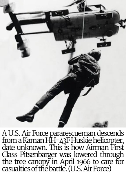 pararescuemanArriving on one of the rescue helicopters, Airman First Class William H. Pitsenbarger of Piqua, Ohio, was an experienced Air Force Pararescue Crewmember from Detachment 6, 38th Aerospace Rescue and Recovery Squadron. Already targeted by sniper and mortar fire, the helicopters were forced to retreat on their second load when the D800 Battalion launched a full-scale assault of the position. Pitsenbarger, who had lowered himself to treat casualties from the battle, opted to remain on the ground in support of the remaining soldiers of Charlie Company, switching between medical duties, ammunition distribution, and combat. Despite sustaining three wounds, he continued this role until he was fatally wounded by sniper fire. For his actions, he was posthumously awarded the Air Force Cross and later, the Medal of Honor.