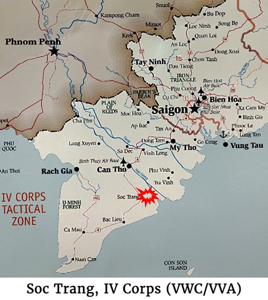 FULL STORY: The airfield at Soc Trang in the southeastern Mekong Delta was built by the French, used by the Japanese during World War Two, and then used by the Americans from 1962 until the South Vietnamese military took full possession in 1970 as part of President Richard Nixon’s Vietnamization policy. In April 1962, U.S. Marine Medium Helicopter Squadron 362 (HMM-362) deployed to Soc Trang Airfield with Sikorsky UH-34s to provide the Army of (South) Vietnam (ARVN) with transport and supply support. Later the airfield was used primarily by the U.S. Army until their 336th Assault Helicopter Company transferred its aviation and support assets, including 31 UH-l “Huey” helicopters to the (South) Vietnamese Air Force (VNAF) on November 4, 1970, when the airfield was officially turned over to the South Vietnamese as part of the Republic of Vietnam Armed Forces (RVNAF) Improvement and Modernization Program. While the U.S. military continued to use the airfield until January 1973 when the Map of Soc Trang, IV Corps (VWC/VVA)last U.S. troops left Vietnam, U.S. air units were no longer based there.