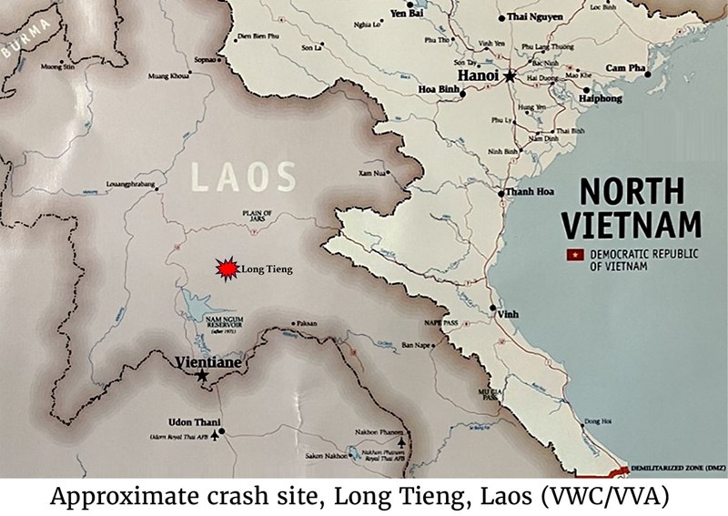 Map of the approximate crash site, Long Tieng, Laos (VWC/VVA)SUMMARY: On August 19, 1969, the pilot of an Air America Pilatus PC-6C Porter carrying 12 passengers was shot by hostile ground fire while ascending out of the airfield at Long Tieng in the southwestern Plain of Jars in northern Laos. He lost control of the aircraft and crashed into a hillside. The plane erupted in flames. There were no survivors. Those killed included the pilot, two other Americans, both U.S. Army officers working for Project 404, and ten indigenous Hmong Laotians.