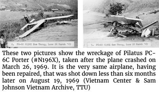 Photos of the wreckage of the Pilatus PC- 6C Porter (#N196X), taken after the plane crashed on March 26, 1969. It is the very same airplane, having been repaired, that was shot down less than six months later on August 19, 1969 (Vietnam Center & Sam Johnson Vietnam Archive, TTU)These men are honored together on Panel W19, Lines 72-75 of the Vietnam Veterans Memorial in Washington, D.C.