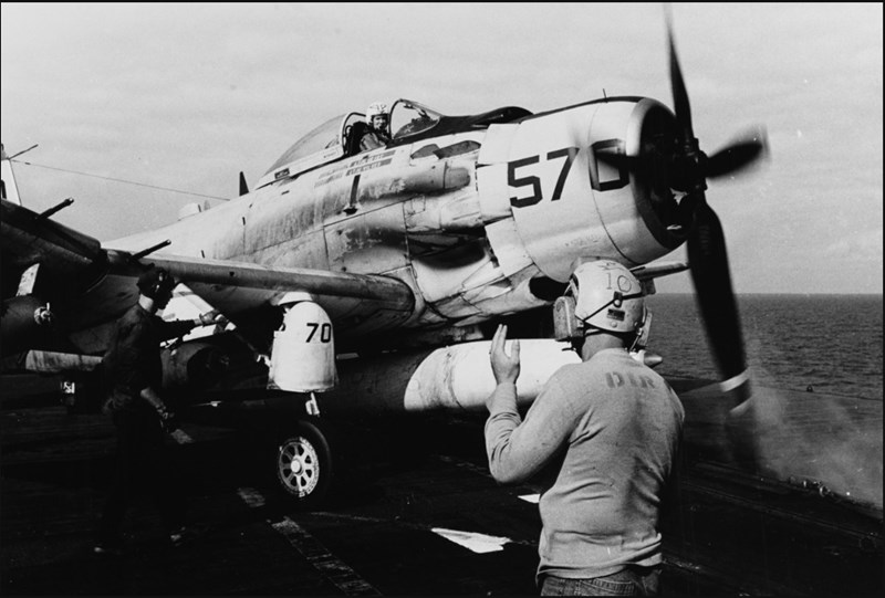 An A-1 Skyraider about to launch from the deck of the USS Hancock, May 6, 1966. (U.S. Navy)