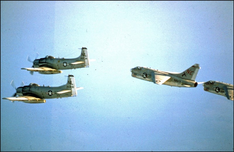 Two A-1 Skyraider attack aircraft and two A-7 Corsair II attack aircraft over the Gulf of Tonkin head toward North Vietnam on a combat mission, January 1968. (U.S. Navy)