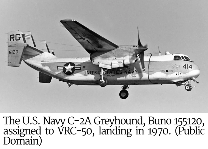 On December 15, 1970, C-2A Greyhound, Bureau Number 155120, flew from Cubi Point to USS Ranger (CVA-61) on Yankee Station and offloaded its passengers and mail.