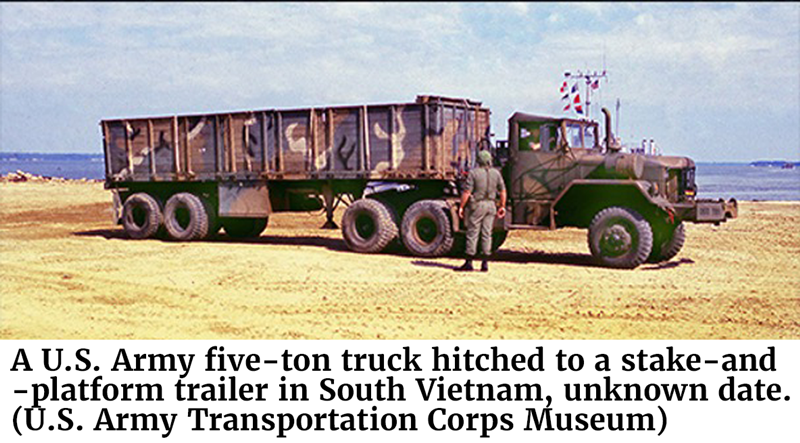 A U.S. Army five-ton truck hitched to a stake-and-platform trailer in South Vietnam, unknown date. (U.S. Army Transportation Corps Museum)Chaos momentarily reigned along the road. Hammersla’s jeep received a glancing blow from a mortar round and, though he survived the explosion, his vehicle was disabled. The truck in front of Hammersla stopped, as many of the convoy troops left their vehicles and dove for cover in the ditch along the roadway. Those trucks with mounted machine guns returned fire, but trucks and S&Ps caught fire up and down the line.