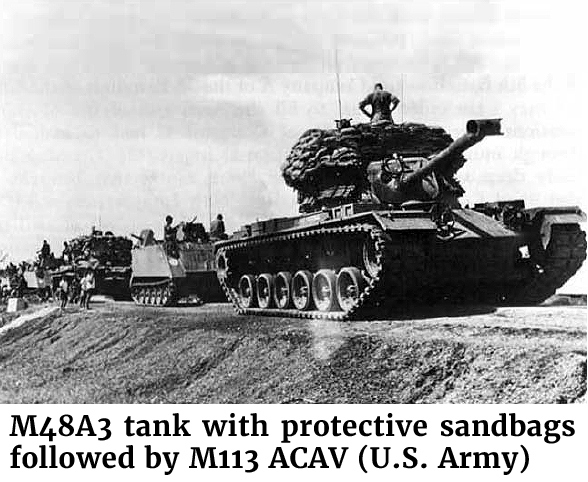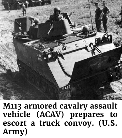 M113 armored cavalry assault vehicle (ACAV) prepares to escort a truck convoy. (U.S. Army)On December 31, 1967, two platoons consisting of eleven armored cavalry vehicles, including two tanks and seven ACAVs, headed south down Highway QL-2 toward Vung Tau on the coast. The tanks led each platoon, occasionally shining searchlights into the darkness. Less than an hour after departure, and barely six miles out, the lead tank of the lead platoon was hit with a rocket-propelled grenade (RPG), which killed the driver instantly and stopped the tank in its tracks in the middle of the road. RPGs then hit the leading ACAVs, setting them on fire. The VC ambush then opened up along the entire length of the column—more than a mile— with small arms fire killing most of the men riding atop the vehicles. The tank leading the rear platoon was also taken out with an RPG, and the mortar carrier bringing up the rear of the column was blown up by a command detonated mine, which also caused the mortar ammunition to explode. The devastation was complete. The attack had lasted less than ten minutes. Of the 45 men aboard the vehicles, 10 died that morning and 25 were wounded, 3 of whom died later of their wounds. One tank and four ACAVs were totally destroyed. The other tank and three ACAVs were severely damaged, useful only for parts. The two platoons “were rendered combat ineffective.” No enemy were reported killed or wounded in the attack.Photo of a M48A3 tank with protective sandbags followed by M113 ACAV (U.S. Army)