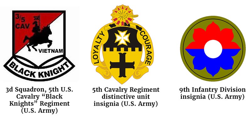 Composite graphic of the 3d Squadron, 5th U.S. Cavalry “Black Knights”, the 5th Cavalry Regiment distinctive unit and the 9th Infantry Division insignias. All provided by the U.S. Army.