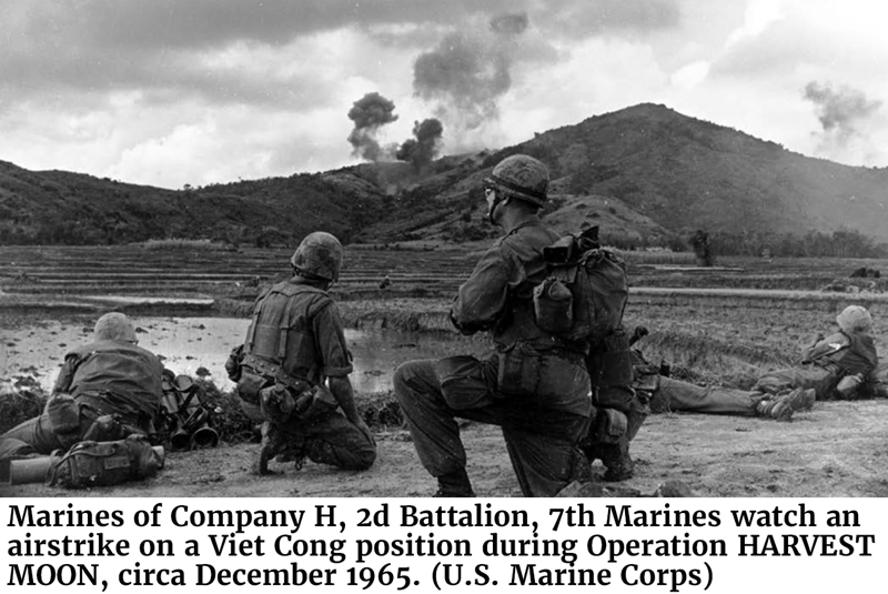 Marines of Company H, 2d Battalion, 7th Marines watch an airstrike on a Viet Cong position during Operation HARVEST MOON, circa December 1965. (U.S. Marine Corps)HARVEST MOON ended on December 20, 1965. The operation added greatly to the conclusion that U.S. troops had a distinct advantage over Communist troops in open firefights, but that Viet Cong units were extremely skilled at setting ambushes and in evading, flanking, and encirclement maneuvers. At times, it seemed nearly impossible to catch large units of insurgents in the open, where American advantages in firepower and technology could be brought to bear. These realities remained true for the entirety of the war. The Marines lost 51 killed and 256 wounded during HARVEST MOON. They learned that more advanced planning, better coordination of air support and medical evacuations, and more efficient airmobile tactics would be necessary for successes in the battles to come.1