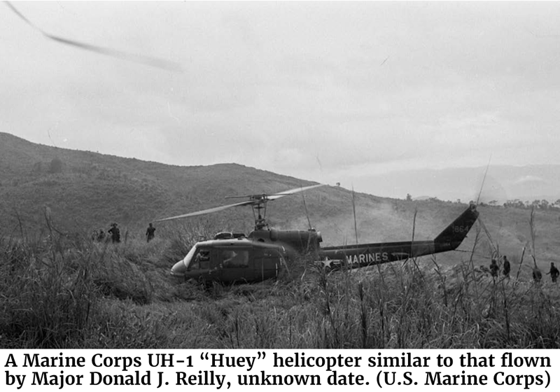 A Marine Corps UH-1 “Huey” helicopter similar to that flown by Major Donald J. Reilly, unknown date. (U.S. Marine Corps)After scouting targets for the helicopter gunships on the scene, Reilly decided to help evacuate wounded Marines before returning to base. Because of the intensity of the Viet Cong fire all around, he opted to make his landing without lights, preferring to use the gathering darkness to make his helicopter a less visible target. He arranged to have a single Marine with a flashlight guide him in. But the enemy fire came fast and furious, even if it was poorly aimed due to the growing twilight. When the aircraft was just a few dozen feet above the ground, a single round entered the Huey cockpit and hit Reilly, causing him to lose control of the helicopter. The rest of Reilly’s crew survived the crash. Reilly did not.