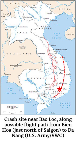 Map of the crash site near Bao Loc, along a possible flight path from Bien Hoa (just north of Saigon) to Da Nang. (U.S. Army/VWC)SUMMARY: On Sunday, February 11, 1962, a Douglas SC-47A aircraft assigned to Detachment 2A (Det 2A), 4400th Combat Crew Training Squadron (4400th CCTS), 314th Air Division, 13th Air Force, took off from Bien Hoa on an aerial leaflet distribution mission. The leaflets the crew were dropping on a flight path from Saigon to Da Nang bore President Kennedy’s New Year’s greeting to the South Vietnamese people. The aircraft received enemy small arms fire and crashed in the mountains about 11 miles west-southwest of Bao Loc in the Lam Dong Province of South Vietnam. All six U.S. Air Force air commando crewmembers, two U.S. Army psychological warfare specialists, and one South Vietnamese Air Force (VNAF) “trainee” died in the crash.