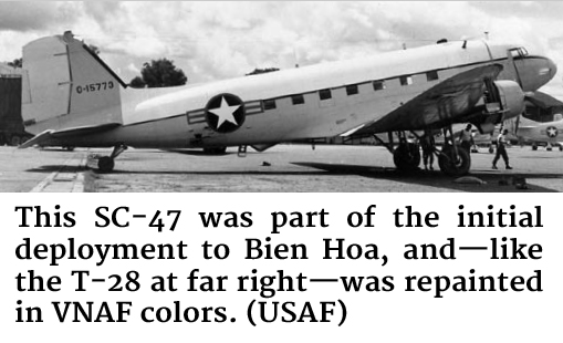 In response, the U.S. Air Force resurrected the World War II “air commando” concept, and stood up the 4400th CCTS, a top-secret air commando squadron named Jungle Jim. Soon afterwards, in National Security Action Memorandum 104, President Kennedy directed Secretary McNamara to “introduce the Air Force ‘Jungle Jim’ Squadron into Vietnam for the initial purpose of training Vietnamese forces.”  Jungle Jim’s Detachment 2 (known as Operation FARM GATE), consisting of 151 officers and men, flying eight T-28s, four SC-47As, and four RN-26s, deployed to South Vietnam in November 1961. The aircraft carried the red-and-yellow VNAF insignia, and the crew wore plain flight suits, unadorned with any American markings or name tags. All missions included at least one South Vietnamese national onboard. Their mission, indeed, their existence, fell firmly into the realm of plausible deniability.