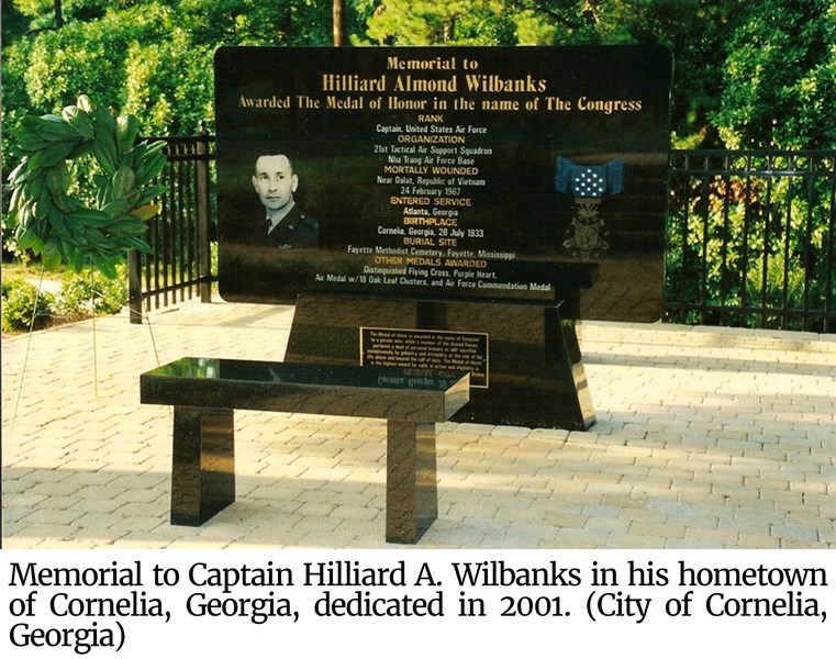Photo of Wilbanks' memorial in his hometown of Cornelia, Georgia, dedicated in 2001.Wilbanks’ Bird Dog was being pummeled by ground fire. One adviser on the ground with the rangers recalled: “[with] each pass, we could hear his plane being hit.” But Wilbanks persisted. On his third pass, Wilbanks was hit. He slumped at his controls and his plane made a level descent, crashing into the hillside approximately 100 yards from the enemy force. A medevac chopper braved the enemy fire to reach Wilbanks’ crash site as South Vietnamese and American servicemen pulled him from the wreckage. Wilbanks was unconscious but alive. Tragically, he died of his wounds in the helicopter before he could reach medical attention.