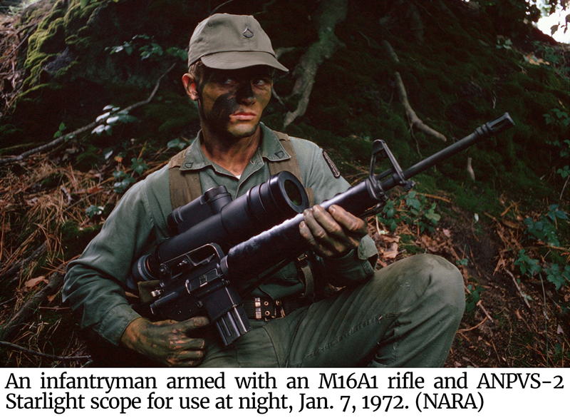 The first night vision devices were developed by Germans just prior to World War II. After 20 years of technological development, American scientists created the Starlight scope, a first-generation passive night vision device. The scope amplified existing light to allow its user to see effectively in the dark without an external infrared light source required by earlier technology versions. The Army spent $25 million to develop the Starlight scope, which in the mid-1960s cost between $2 thousand and $5 thousand dollars, depending on the size. The Starlight scope’s night vision technology was classified and considered so advanced that American advisors were not authorized to give their South Vietnamese Army counterparts even a peek through the eyepiece in order to keep the technology secret.