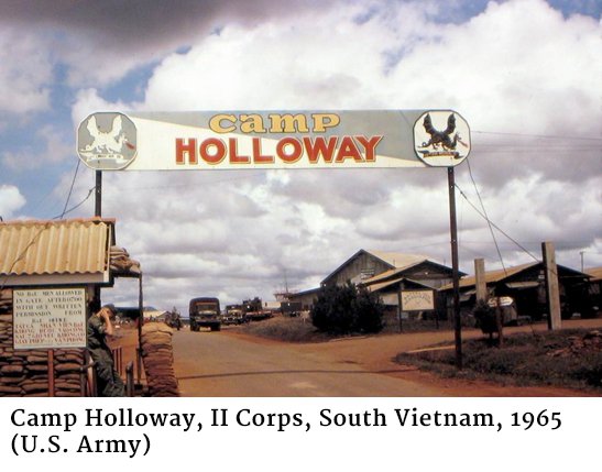 Early in the morning on February 7, 1965, two teams of sappers from the Viet Cong’s (VC) 30th Company— heavily armed with demolition charges, 81mm mortars, 7.62-mm automatic weapons, and possibly a bazooka—broke through the inner perimeter defenses at Camp Holloway. Before leaving, they blew up sixteen Huey helicopters (five of which were beyond repair, or even recognition), two CV–2 transports, and four O–1F FAC planes, one of which belonged to the South Vietnamese air force and was stationed temporarily at the airfield. They also killed or mortally wounded nine Soldiers, and injured as many as 125 others. The enemy slipped into the darkness without having sustained a single casualty.