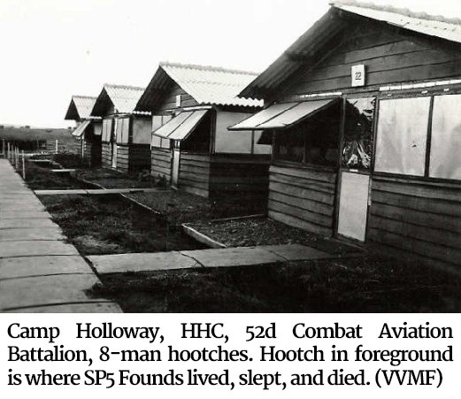 Photo of Camp Holloway, HHC, 52d Combat Aviation Battalion, 8-man hootches. Hootch in foreground is where SP5 Founds lived, slept, and died. (VVMF)