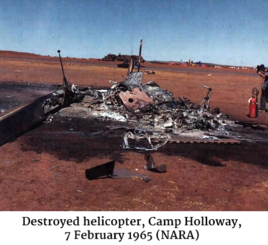 Photo of a destroyed helicopter, Camp Holloway, 7 February 1965 (NARA)Meanwhile, another sapper team attacked the II Corps MACV compound, but with less terrible results. An American guard interrupted their surreptitious entry into the grounds by shooting one of the intruders before himself being blown up by a demolition charge. It was enough to warn the rest of the compound, who quickly joined the fight. Twenty-four Americans were wounded, but only the heroic guard was killed in the raid. The enemy left one of their compatriots, whom the guard had shot. He was captured at daylight.