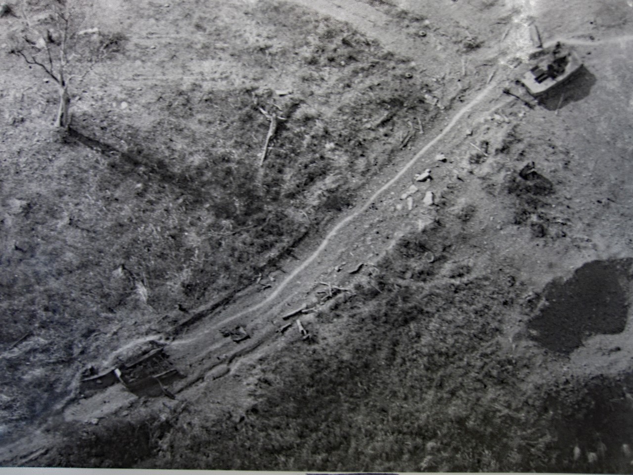 Aerial photograph from the aftermath of the battle of Lang Vei showing two destroyed North Vietnamese tanks, circa February 1968. (U.S. Army)