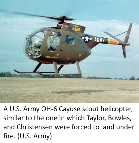On the morning of January 15, visibility was poor and the ceiling was low, as a misty rain floated through light fog and overcast skies. As Taylor flew the Cayuse over a clearing, sudden bursts of AK-47 rifle fire pelted the helicopter. With the engine compromised, he was forced to make an emergency landing. With composure and skill, he managed to land the crippled OH-6 safely. An investigation later found that all three men had survived the landing. But as soon as they hit the gA U.S. Army OH-6 Cayuse scout helicopter, similar to the one in which Taylor, Bowles, and Christensen were forced to land under fire. (U.S. Army)round, the helicopter was attacked by the same men who had fired on it in the air. Deane Taylor, Bruce Bowles, and Jan Christensen were all killed and their helicopter was burned. They are each remembered on Panel 34W, Lines 4–11, of the Vietnam Veterans Memorial Wall in Washington, D.C.