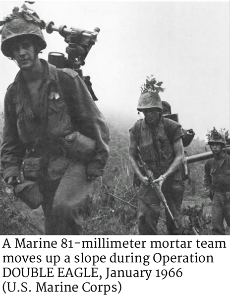 A Marine 81-millimeter mortar team moves up a slope during Operation DOUBLE EAGLE, January 1966. (U.S. Marine Corps)Early the next morning, visibility remained so poor that the Force Recon Marines had trouble locating a route down the steep-sided hill. They traveled along the ridgeline, sometimes backtracking, for more than two hours before finally finding a place to climb down. Making matters more precarious, the brush and grass on the hillside was eight feet high in most places, and so the column of men became spread out during the descent. Suddenly, approximately 50 Viet Cong fighters attacked the Marines from the rear with automatic weapons and grenades. The Recon Marines were in an indefensible position, so they tried to break contact by running down the hill while the rearmost men fired back on their pursuers. As 1st Lieutenant Richard F. Parker, Jr., wryly wrote in his after-action report, “the entire descent was made under conditions of heavy attack, and not a controlled movement.”