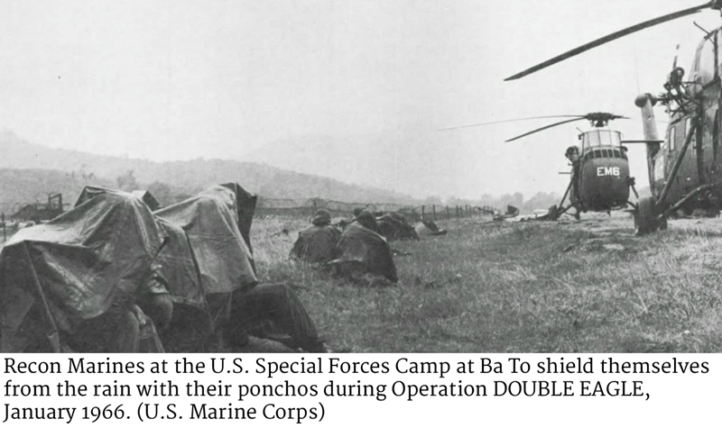 Recon Marines at the U.S. Special Forces Camp at Ba To shield themselves from the rain with their ponchos during Operation DOUBLE EAGLE, January 1966. (U.S. Marine Corps)On January 21, 14 Marines were on just such a reconnaissance mission west of Ba To, in the farthest reaches of DOUBLE EAGLE’s area of operations. Thirteen were from 1st Force Recon Company, 3d Reconnaissance Battalion. The fourteenth man was a forward artillery observer from the 12th Marines. The weather was dreadful. Pelting rains hounded the Marines, and the fog and mist in the western Quang Ngai mountains were often so thick, the Marines could see only 50 feet in front of their faces. To reach higher ground before nightfall, the Marines trudged up to a steep-sided ridgeline called Hill 829, where they began making camp.