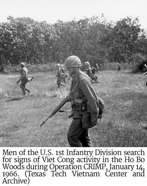 ho bo woodsFULL STORY: Participants in Operation CRIMP were comprised of the United States Army 173d Airborne Brigade, the 28th Infantry Regiment of the 1st Infantry Division, and the 1st Battalion of the Royal Australian Regiment. In all, about 8,000 men. These ground forces were also amply supported by artillery and American airpower, including preparatory strikes by U.S. Air Force B-52 Stratofortresses. The operation took place in the