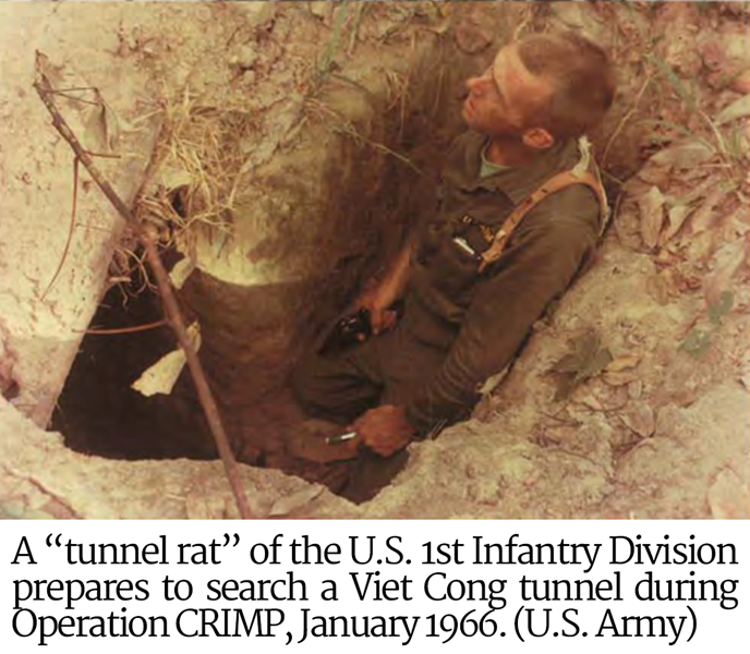 tunnel ratThe Communist base facility in the Ho Bo Woods consisted of a vast complex of tunnels that boasted barracks, hospitals, kitchens, storage depots and munitions shops. Extensive searches also turned up thousands of pages of vital intelligence, including lists of Communist Party members in South Vietnam, documents revealing the local VC command structure, detailed maps, and the notebook known as the “CRIMP Document” of a senior political officer. Collectively, the tunnels—later known as the Cu Chi Tunnels—contained one of the most important intelligence collections found by U.S. or allied forces during the war.