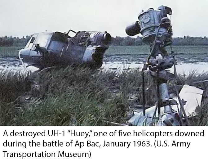 Map showing the planned assault on Viet Cong insurgents outside Ap Bac. The assault was ultimately a failure. (U.S. Army)In the final days of 1962, the South Vietnamese 7th Infantry Division received intelligence on the location of a Viet Cong main-force battalion hiding near the Mekong Delta village of Ap Bac. With the help of American advisers, South Vietnamese commanders planned an operation to trap and destroy them. The battle, however, was a disaster from the start. As the firefight began, South Vietnamese commanders remained tentative and were reluctant to take risks, although they outgunned and outnumbered the enemy force—possibly by as much as four to one—and despite the exhortations of American advisers at the scene. Some refused to engage in the battle altogether. A number of South Vietnamese and American men were caught in an open rice paddy, with only low earthen dikes for cover. During subsequent attempts to reinforce them, South Vietnamese paratroopers dropped in on the wrong side of the battlefield, and Viet Cong troops downed a total of five U.S. helicopters before noon. In total, 80 South Vietnamese soldiers were killed and 100 were wounded at Ap Bac. Three Americans were killed and 10 others were wounded. Assessments of Viet Cong casualties varied, but one estimate was approximately 18 of them had been killed. When night fell, the vast majority of the insurgents slipped away and escaped the battlefield, ending the battle.