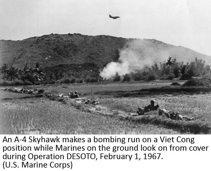 An A-4 Skyhawk makes a bombing run on a Viet Cong position while Marines on the ground look on from cover during Operation DESOTO, February 1, 1967 (U.S. Marine Corps)Even in the gathering darkness, the incoming helicopters took heavy fire from the hamlet. The twin-rotor CH-46 Sea Knight helicopters of HMM-262 set down to the rear of Company M’s position, and their door gunners dealt as much covering fire as they could while supplies and ammunition were unloaded and wounded and dead Marines were loaded aboard. One of the door gunners was Sergeant Clarence I. Henry, a 28-year-old crew chief and 10-year veteran from Franklin, Louisiana. Henry fired his machine gun furiously, but at one point he could not bring it to bear on one of the main bunkers. He detached it and began setting up the gun in the opposite door to get a better angle, but as he did an enemy machine-gun round struck him in the eye. Somehow, Henry was not killed instantly. But he lingered for only minutes, dying before receiving medical attention. The Marine Corps posthumously awarded Henry an Air Medal and a promotion to Staff Sergeant.