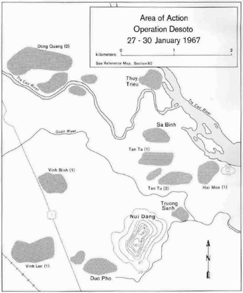 Map of Area of Action for Operation DESOTOSUMMARY:  On January 28, 1967, during Operation DESOTO, a company of U.S. Marines advanced on the hamlet of Tan Tu, in eastern Quang Ngai Province. A large force of Viet Cong fighters occupied the small collection of houses, and as the Marines approached they were met with a storm of machine gun and rifle fire from a large bunker complex in front of the village. The occupiers repelled the Marines twice, during which four riflemen and two corpsmen were killed and numerous others wounded. The Marine company had to wait for nightfall to evacuate their casualties, and during the evacuation, a fifth Marine, a door gunner on an evacuation helicopter, was also killed. The Americans finally chased the remaining Communist troops out of Tan Tu the next day, January 29.