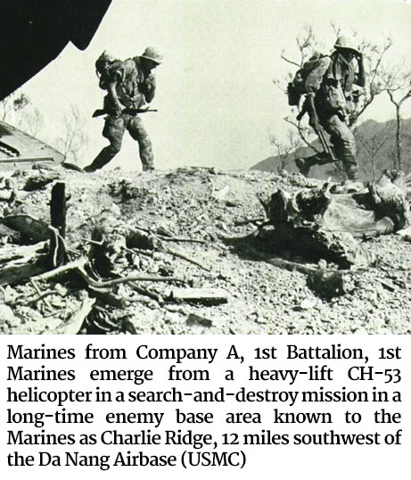 Photo of Marines from Company A, 1st Battalion, 1st Marines emerging from a heavy-lift CH-53 helicopter in a search-and-destroy mission in a long-time enemy base area known to the Marines as Charlie Ridge, 12 miles southwest of the Da Nang Airbase (USMC)On June 31, 1970, 2d Platoon, A Co., 1/1 Marines set out at daybreak on a Kingfisher patrol in search of the enemy, and found him. The platoon was dropped off to fight, with close air support provided by Cobras, while the Sea Knights returned to base to pick up 3d Platoon to provide a blocking force to prevent any enemy engaged with 2d Platoon from escaping the battlefield. The men of 3d platoon disembarked in a rice paddy and, in pursuit of a lone VC guerilla, moved quickly to a nearby clearing. The enemy had led them into a minefield. After two mines had been detonated – half a dozen Marines had been wounded, and one killed –the realization of their predicament had sunk in.
