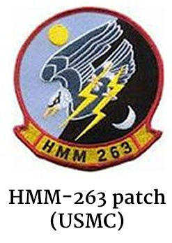 1st Battalion, 1st Marine Regiment, 1st Marine Division insignia (USMC)Almost immediately, a Sea Knight named “Blood, Sweat, and Tears” from Marine Medium Helicopter Squadron 263 (HMM-263, nicknamed “Gopher Broke”), Marine Aircraft Group 16, 1st Marine Aircraft Wing landed right in the minefield. The crew chief had directed the pilot to carefully landed with the front wheels in one of the mine craters, and the rear wheels in the other—ensuring both that the helicopter would not accidentally detonate another mine, and would be near to the injured and beleaguered Marines. The crew chief then exited the helicopter, disobeying a direct order from the pilot that no one leave the aircraft, raced into the minefield, collected wounded Marines, and carried them to the aircraft. Several more mines exploded and more Marines were wounded and killed. The crew chief made six trips into the minefield before all of the Marines, a dozen wounded and three others dead (including a Navy corpsman), were aboard and he could at last signal the pilot to lift off.