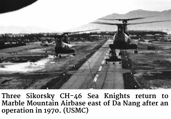 Photo of three Sikorsky CH-46 Sea Knights returingn to Marble Mountain Airbase east of Da Nang after an operation in 1970. (USMC)The 1st Marine Division participated in a new system of heliborne combat patrols codenamed Kingfisher, which were offensive in nature, designed to seek out the enemy from the air and land troops to fight if the enemy was spotted. The Kingfisher patrol consisted of a reinforced rifle platoon aboard three Boeing CH-46B Sea Knight helicopters, accompanied by four Bell UH-1G Huey Cobra gunships, a North American OV-10 Bronco carrying an aerial observer, and fixed-wing air support on call. The Kingfisher patrols generally began at first light, one rifle platoon aboard the helicopters and the rest of the company ready to reinforce at a moment’s notice.
