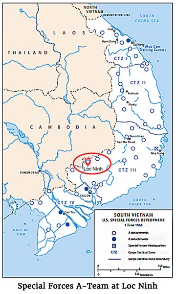 On July 17, 1963, SF Det A5-22 arrived to relieve Det A5-18 at Loc Ninh, a SF/CIDG border surveillance camp in Binh Long Province. The MAAGV SF teams supported a garrison of three CIDG companies (two of which were Cambodian) commanded by an Army of the Republic of (South) Vietnam (ARVN) Airborne Special Forces (LLDB) captain.