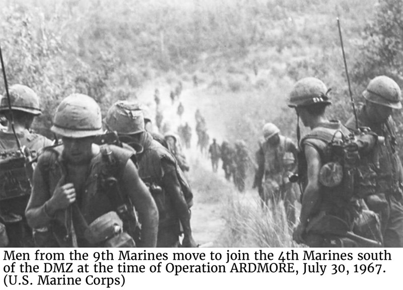 Men from the 9th Marines move to join the 4th Marines south of the DMZ at the time of Operation ARDMORE, July 30, 1967. (U.S. Marine Corps)On July 21, 1967, Morrow was with the trailing platoon of Company M out on a search-and-clear mission during Operation ARDMORE. At one point, the platoon walking point for the company column ran into a North Vietnamese ambush. During the ensuing firefight, the lead Marine platoon’s commander was killed, followed in rapid succession by the platoon sergeant and one of the platoon’s squad leaders. The platoon was suddenly leaderless. As they scrambled to defend themselves, someone managed to radio for help and reinforcements. Morrow heard the radio call and realized the platoon had lost its commanders. He immediately volunteered to dash forward and take command.